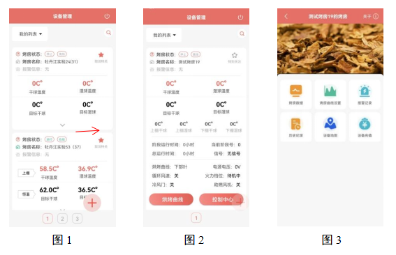 進入APP后會出現(xiàn)圖1所示的界面,能夠看到烤房當前的各參數(shù)數(shù)值;能對已綁定烤房進行特別關(guān)注操作; 點擊下箭頭會出現(xiàn)烤房更詳細的當前狀態(tài)信息,點擊“烘烤曲線”選項能夠查看此烤房各項指標隨時間的變化的曲線; 點擊“控制中心”選項后會顯示圖3所示控制中心界面。