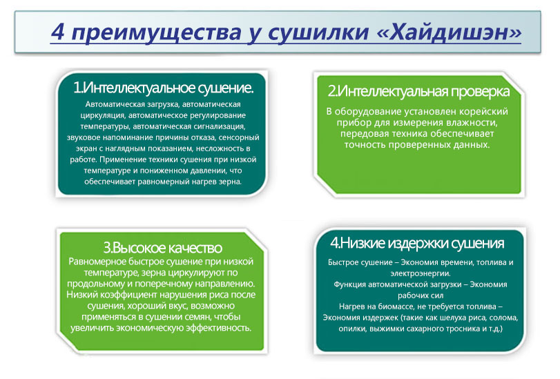 В результате многолетнего сосредоточенного исследования ООО Ляонинская машиностроительная компания ?Хайдишэн? разработала зерносушилку, которая применяется в сушении риса, кукурузы, ячменя, пшеницы и других видов зерна. В сушилке применена передовая техники, характеризуется высокой степенью автоматизации, несложностью и надежностью в работе, низким уровнем шума и вибрации, экономией топлива, коротким времени сушения. По сравнению с другими оборудованиями с одинаковой производительностью размер экономии энергии составляет 20-25%.